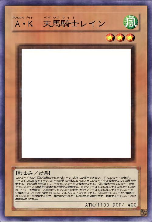 | このカード名の①②の効果はそれぞれ1ターンに1度しか使用できない。 ①このカードが相手フィールド上に存在するモンスターの効果の対象になったときこのカードを守備表示にして効果を発動する。その効果を無効化し、そのモンスターを守備表示にする。 ②守備表示のこのカードが相手モンスターとの戦闘で破壊された場合に発動する。自分フィールド上に存在するこのカード以外の「A・K 天馬騎士」と名の付くモンスターの数だけ相手フィールド上に存在するモンスターを守備表示にしてその守備力を0にし、バトルフェイズを終了する。 ③このモンスターが守備表示のモンスターを攻撃するとき、相手は全てのカードの効果を発動できず、戦闘するモンスターの効果は無効化される。 | |||