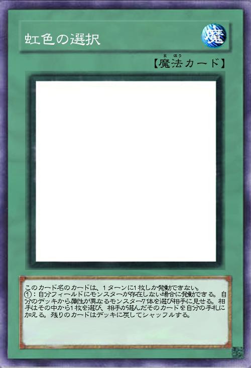 | このカード名のカードは、1ターンに1枚しか発動できない。 ①:自分フィールドにモンスターが存在しない場合に発動できる。自分のデッキから属性が異なるモンスターを7体選び相手に見せる。相手はその中から1枚を選び、相手が選んだそのカードを自分の手札に加える。残りのカードはデッキに戻してシャッフルする。 | |||