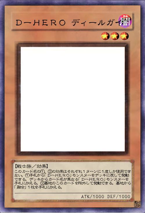 | このカード名の①、②の効果はそれぞれ1ターンに1度しか使用できない。①手札から「DーHERO」モンスターをデッキに戻して発動できる。デッキからカード名が異なる「DーHERO」モンスターを手札に加える。②墓地のこのカードを除外して発動できる。墓地から「融合」1枚を手札に加える。 | |||