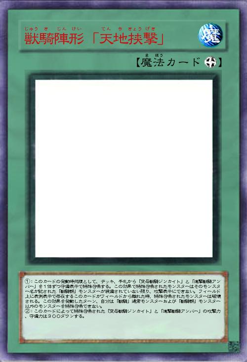 | ①:このカードの発動時処理として、デッキ、手札から「空母獣騎ジンカイト」と「進撃獣騎アンバー」を1体ずつ守備表示で特殊召喚する。この効果で特殊召喚されたモンスターはそのモンスター名が記された「獣騎群」モンスターが装備されていない限り、攻撃表示にできない。フィールド上に表側表示で存在するこのカードがフィールドから離れた時、特殊召喚されたモンスターは破壊される。この効果を発動したターン、自分は「獣騎」通常モンスターおよび「獣騎群」モンスター以外のモンスターを特殊召喚できない。 ②:このカードによって特殊召喚された「空母獣騎ジンカイト」と「進撃獣騎アンバー」の攻撃力、守備力は300ダウンする。 | |||