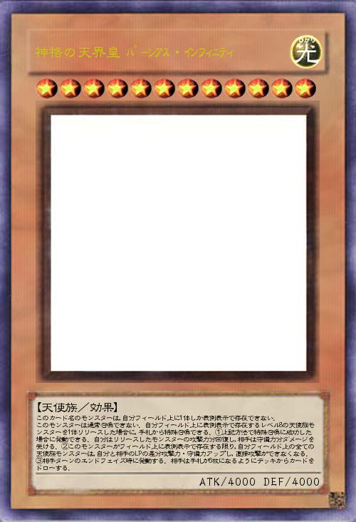 | このカード名のモンスターは,自分フィールド上に1体しか表側表示で存在できない. このモンスターは通常召喚できない.自分フィールド上に表側表示で存在するレベル8の天使族モンスターを1体リリースした場合に,手札から特殊召喚できる.①上記方法で特殊召喚に成功した場合に発動できる.自分はリリースしたモンスターの攻撃力分回復し,相手は守備力分ダメージを受ける.②このモンスターがフィールド上に表側表示で存在する限り,自分フィールド上の全ての天使族モンスターは,自分と相手のLPの差分攻撃力・守備力アップし,直接攻撃ができなくなる.③相手ターンのエンドフェイズ時に発動する.相手は手札が6枚になるようにデッキからカードをドローする. | |||