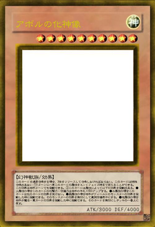 | このカードを通常召喚する場合、3体をリリースして召喚しなければならない。このカードは特殊召喚出来ない ①1ターンに一度このカードの属性をエンドフェイズ時まで変えることができる。この効果は相手ターンでも発動できる。②このカードは属性によって以下の効果を発動出来る。●火属性の場合このカードの攻撃力・守備力は相手の手札×500アップする。●水属性の場合このカードは他のカードの効果を受けない。●風属性の場合相手がフィールドのモンスターの効果を発動した時に発動できる。そのモンスターの効果を無効にして裏側守備表示にする。●地属性の場合相手が魔法・罠カードの効果を発動した時に発動できる。そのカードを無効にしデッキの一番上に戻す。 | |||