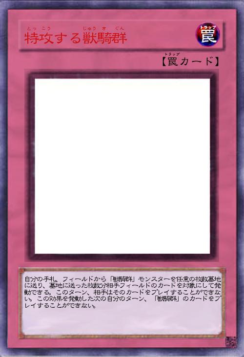 | 自分の手札、フィールドから「獣騎群」モンスターを任意の枚数墓地に送り、墓地に送った枚数分相手フィールドのカードを対象にして発動できる。このターン、相手はそのカードをプレイすることができない。この効果を発動した次の自分のターン、「獣騎群」のカードをプレイすることができない。 | |||