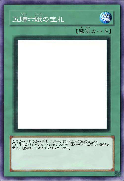 | このカード名のカードは、1ターンに1枚しか発動できない。 ①:手札からレベル5・6のモンスター1体をデッキに戻して発動できる。自分はデッキから2枚ドローする。 | |||