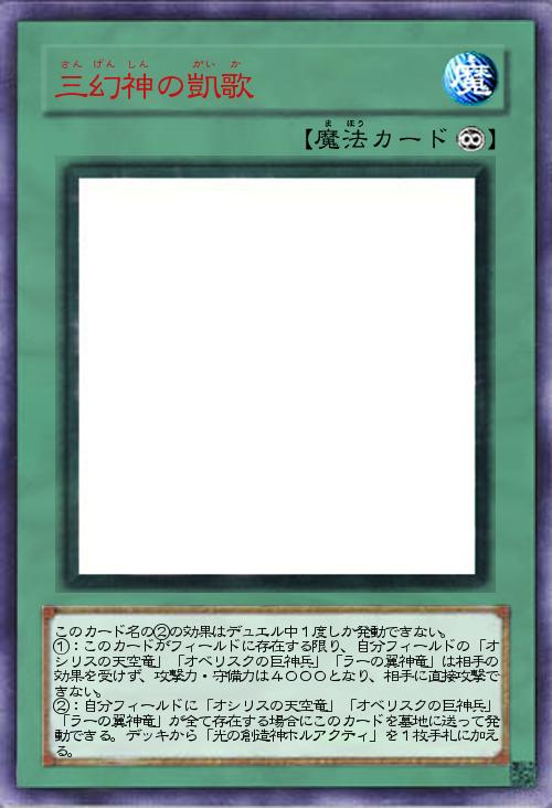 | このカード名の②の効果はデュエル中1度しか発動できない。 ①:このカードがフィールドに存在する限り、自分フィールドの「オシリスの天空竜」「オベリスクの巨神兵」「ラーの翼神竜」は相手の効果を受けず、攻撃力・守備力は4000となり、相手に直接攻撃できない。 ②:自分フィールドに「オシリスの天空竜」「オベリスクの巨神兵」「ラーの翼神竜」が全て存在する場合にこのカードを墓地に送って発動できる。デッキから「光の創造神ホルアクティ」を1枚手札に加える。 | |||