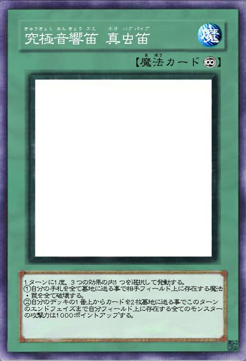 「あっ、3つ目の効果を作り忘れてる!なわけで追加しときます。「③自分の墓地に存在する昆虫族モンスター1体を表側守備表示で特殊召喚する。この効果で特殊召喚した昆虫族モンスターの効果は無効化される。」です。すみません。」(2017-09-19 08:54)