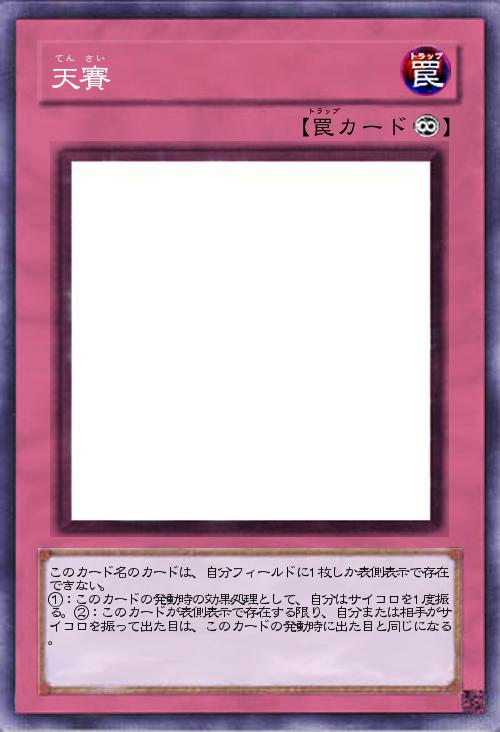 | このカード名のカードは、自分フィールドに1枚しか表側表示で存在できない。 ①:このカードの発動時の効果処理として、自分はサイコロを1度振る。②:このカードが表側表示で存在する限り、自分または相手がサイコロを振って出た目は、このカードの発動時に出た目と同じになる。 | |||