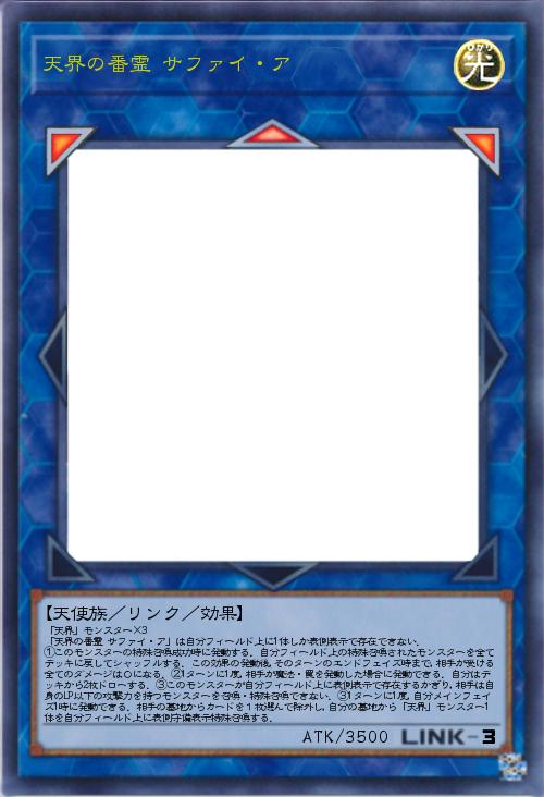 | 「天界」モンスター×3 「天界の番霊 サファイ・ア」は自分フィールド上に1体しか表側表示で存在できない. ①このモンスターの特殊召喚成功時に発動する.自分フィールド上の特殊召喚されたモンスターを全てデッキに戻してシャッフルする.この効果の発動後,そのターンのエンドフェイズ時まで,相手が受ける全てのダメージは0になる.②1ターンに1度,相手が魔法・罠を発動した場合に発動できる.自分はデッキから2枚ドローする.③このモンスターが自分フィールド上に表側表示で存在するかぎり,相手は自身のLP以下の攻撃力を持つモンスターを召喚・特殊召喚できない.③1ターンに1度,自分メインフェイズ1時に発動できる.相手の墓地からカードを1枚選んで除外し,自分の墓地から「天界」モンスター1体を自分フィールド上に表側守備表示特殊召喚する. | |||
