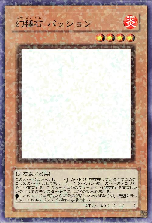 「6枚目です。これで一通りの6属性カテゴリウムモンスターは完成しました。パッションの意味は情熱。赤い原石の彼は、熱血、情熱の仕草で、カテゴリのモンスターを躍起にさせます。しかし躍起になりすぎて戦闘終了時に力尽きてしまう。恐ろしい・・・このカードは効果を受けませんが、他のカテゴリウム達も受けてしまうので注意が必要。うまく行けば、レインボーライフなどで大量回復&全破壊も狙えるかも?次からは上級カテゴリウムモンスターか、カテゴリウム魔法・罠を作っていきたいと思います。」(2017-09-25 19:52)