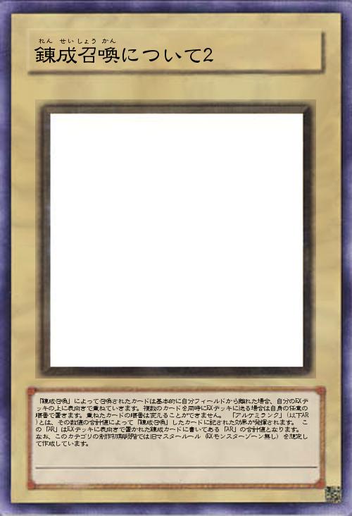 | 「錬成召喚」によって召喚されたカードは基本的に自分フィールドから離れた場合、自分のEXデッキの上に表向きで重ねていきます。複数のカードを同時にEXデッキに送る場合は自身の任意の順番で置きます。重ねたカードの順番は変えることができません。 「アルケミランク」(以下AR)とは、その数値の合計値によって「錬成召喚」したカードに記された効果が発揮されます。 この「AR」はEXデッキに表向きで置かれた錬成カードに書いてある「AR」の合計値となります。 なお、このカテゴリの制作初期段階では旧マスタールール(EXモンスターゾーン無し)を想定して作成しています。 | |||