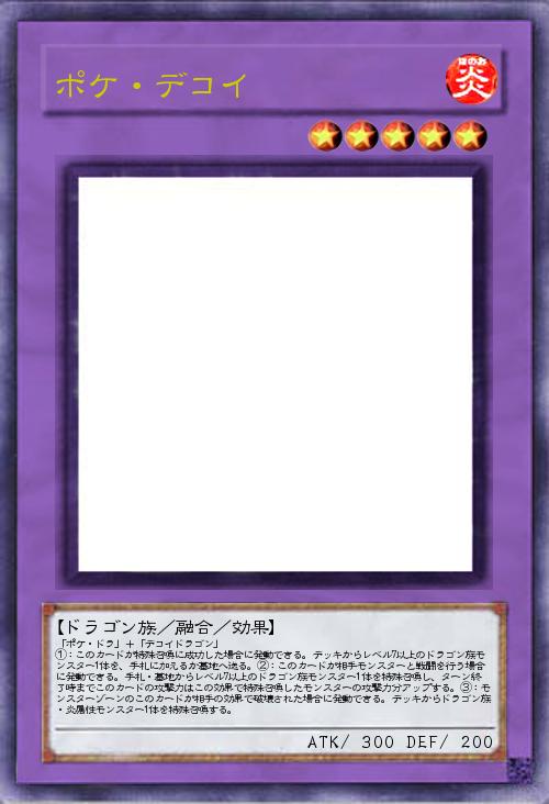 | 「ポケ・ドラ」+「デコイドラゴン」 ①:このカードが特殊召喚に成功した場合に発動できる。デッキからレベル7以上のドラゴン族モンスター1体を、手札に加えるか墓地へ送る。②:このカードが相手モンスターと戦闘を行う場合に発動できる。手札・墓地からレベル7以上のドラゴン族モンスター1体を特殊召喚し、ターン終了時までこのカードの攻撃力はこの効果で特殊召喚したモンスターの攻撃力分アップする。③:モンスターゾーンのこのカードが相手の効果で破壊された場合に発動できる。デッキからドラゴン族・炎属性モンスター1体を特殊召喚する。 | |||