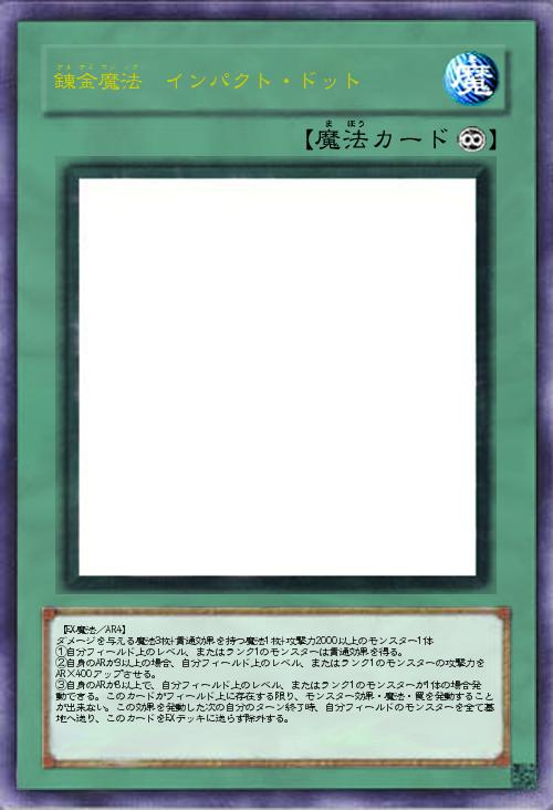 | 【EX魔法/AR4】 ダメージを与える魔法3枚+貫通効果を持つ魔法1枚+攻撃力2000以上のモンスター1体 ①自分フィールド上のレベル、またはランク1のモンスターは貫通効果を得る。 ②自身のARが3以上の場合、自分フィールド上のレベル、またはランク1のモンスターの攻撃力をAR×400アップさせる。 ③自身のARが8以上で、自分フィールド上のレベル、またはランク1のモンスターが1体の場合発動できる。このカードがフィールド上に存在する限り、モンスター効果・魔法・罠を発動することが出来ない。この効果を発動した次の自分のターン終了時、自分フィールドのモンスターを全て墓地へ送り、このカードをEXデッキに送らず除外する。 | |||