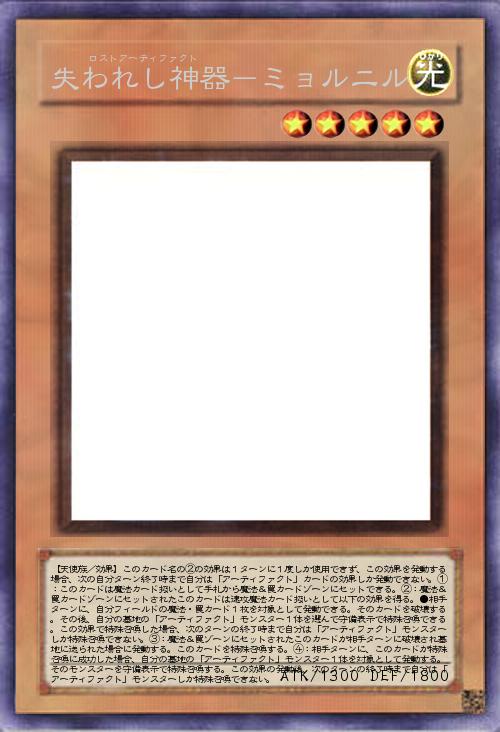 | 【天使族/効果】このカード名の②の効果は1ターンに1度しか使用できず、この効果を発動する場合、次の自分ターン終了時まで自分は「アーティファクト」カードの効果しか発動できない。①:このカードは魔法カード扱いとして手札から魔法&罠カードゾーンにセットできる。②:魔法&罠カードゾーンにセットされたこのカードは速攻魔法カード扱いとして以下の効果を得る。●相手ターンに、自分フィールドの魔法・罠カード1枚を対象として発動できる。そのカードを破壊する。その後、自分の墓地の「アーティファクト」モンスター1体を選んで守備表示で特殊召喚できる。この効果で特殊召喚した場合、次のターンの終了時まで自分は「アーティファクト」モンスターしか特殊召喚できない。③:魔法&罠ゾーンにセットされたこのカードが相手ターンに破壊され墓地に送られた場合に発動する。このカードを特殊召喚する。④:相手ターンに、このカードが特殊召喚に成 | |||