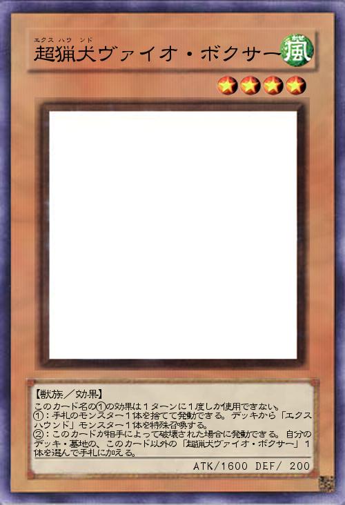 | このカード名の①の効果は1ターンに1度しか使用できない。 ①:手札のモンスター1体を捨てて発動できる。デッキから「エクスハウンド」モンスター1体を特殊召喚する。 ②:このカードが相手によって破壊された場合に発動できる。自分のデッキ・墓地の、このカード以外の「超猟犬ヴァイオ・ボクサー」1体を選んで手札に加える。 | |||