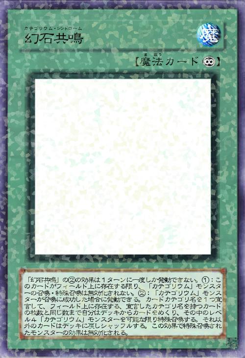 | 「幻石共鳴」の②の効果は1ターンに一度しか発動できない。①:このカードがフィールド上に存在する限り、「カテゴリウム」モンスターの召喚・特殊召喚は無効化されない。②:「カテゴリウム」モンスターが召喚に成功した場合に発動できる。カードカテゴリ名を1つ宣言して、フィールド上に存在する、宣言したカテゴリ名を持つカードの枚数と同じ数まで自分はデッキからカードをめくり、その中のレベル4「カテゴリウム」モンスターを可能な限り特殊召喚する。それ以外のカードはデッキに戻しシャッフルする。この効果で特殊召喚されたモンスターの効果は無効化される。 | |||