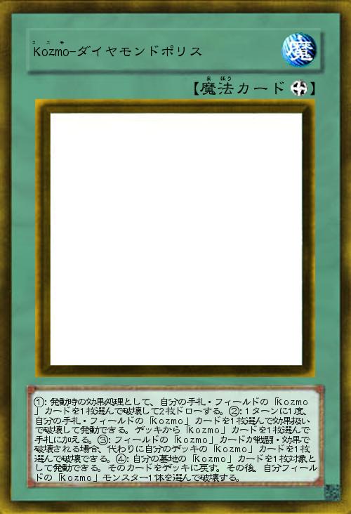 | ①:発動時の効果処理として、自分の手札・フィールドの「Kozmo」カードを1枚選んで破壊して2枚ドローする。②:1ターンに1度、自分の手札・フィールドの「Kozmo」カードを1枚選んで効果扱いで破壊して発動できる。デッキから「Kozmo」カードを1枚選んで手札に加える。③:フィールドの「Kozmo」カードが戦闘・効果で破壊される場合、代わりに自分のデッキの「Kozmo」カードを1枚選んで破壊できる。④:自分の墓地の「Kozmo」カードを1枚対象として発動できる。そのカードをデッキに戻す。その後、自分フィールドの「Kozmo」モンスター1体を選んで破壊する。 | |||