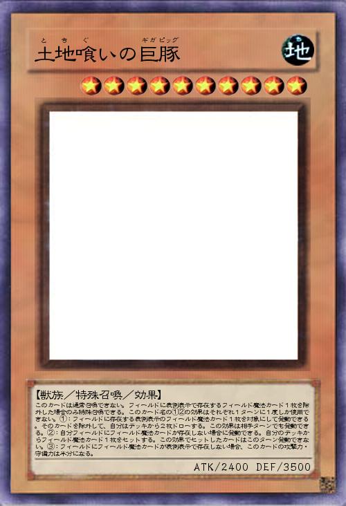 「土地環境を喰らう豚。フィールド魔法を喰らいながら出現し、フィールド魔法を喰らってうんk・・・ドローソースにする。餌がないとステータスが半減するデメリットを持っているので常に発動しておきたいが、2の効果でタイムラグが痛いものの、ノーコストでフィールド魔法をセットできる。