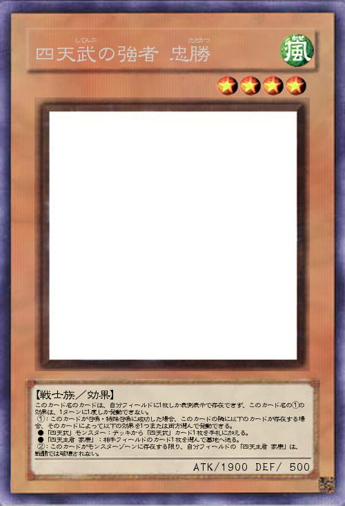 | このカード名のカードは、自分フィールドに1枚しか表側表示で存在できず、このカード名の①の効果は、1ターンに1度しか発動できない。 ①:このカードが召喚・特殊召喚に成功した場合、このカードの隣に以下のカードが存在する場合、そのカードによって以下の効果を1つまたは両方選んで発動できる。 ●「四天武」モンスター:デッキから「四天武」カード1枚を手札に加える。 ●「四天主君 家康」:相手フィールドのカード1枚を選んで墓地へ送る。 ②:このカードがモンスターゾーンに存在する限り、自分フィールドの「四天主君 家康」は、戦闘では破壊されない。 | |||
