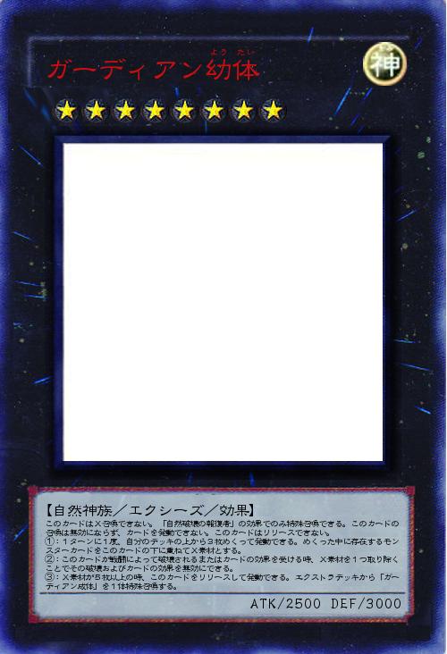 | このカードはX召喚できない。「自然破壊の報復者」の効果でのみ特殊召喚できる。このカードの召喚は無効にならず、カードを発動できない。このカードはリリースできない。 ①:1ターンに1度、自分のデッキの上から3枚めくって発動できる。めくった中に存在するモンスターカードをこのカードの下に重ねてX素材とする。 ②:このカードが戦闘によって破壊されるまたはカードの効果を受ける時、X素材を1つ取り除くことでその破壊およびカードの効果を無効にできる。 ③:X素材が5枚以上の時、このカードをリリースして発動できる。エクストラデッキから「ガーディアン成体」を1体特殊召喚する。 | |||