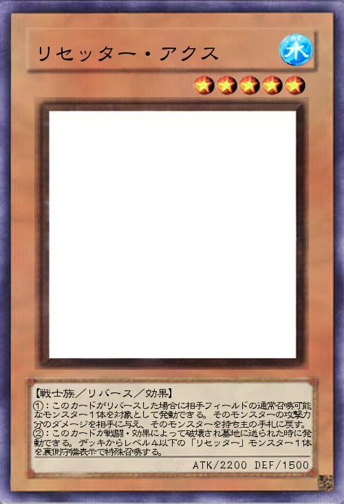 | ①:このカードがリバースした場合に相手フィールドの通常召喚可能なモンスター1体を対象として発動できる。そのモンスターの攻撃力分のダメージを相手に与え、そのモンスターを持ち主の手札に戻す。 ②:このカードが戦闘・効果によって破壊され墓地に送られた時に発動できる。デッキからレベル4以下の「リセッター」モンスター1体を裏側守備表示で特殊召喚する。 | |||