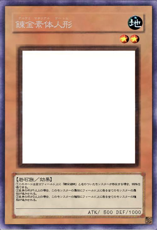 | ①このカードは自分フィールド上に「錬金術師」と名のついたモンスターが存在する場合、特殊召喚できる。 ②自身のARが1以上の場合、このモンスターの属性にフィールド上に居る全てのモンスターの属性が追加される。 ③自身のARが2以上の場合、このモンスターの種族にフィールド上に居る全てのモンスターの種族が追加される。 | |||