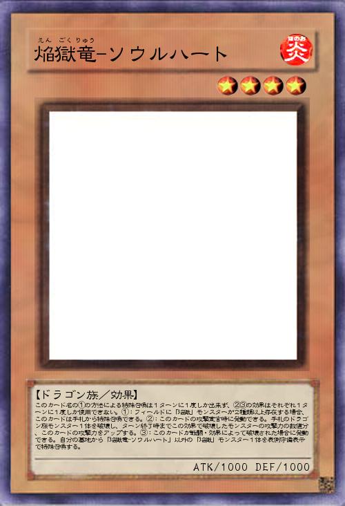 | このカード名の①の方法による特殊召喚は1ターンに1度しか出来ず、②③の効果はそれぞれ1ターンに1度しか使用できない。①:フィールドに「焔獄」モンスターが2種類以上存在する場合、このカードは手札から特殊召喚できる。②:このカードの攻撃宣言時に発動できる。手札のドラゴン族モンスター1体を破壊し、ターン終了時までこの効果で破壊したモンスターの攻撃力の数値分、このカードの攻撃力をアップする。③:このカードが戦闘・効果によって破壊された場合に発動できる。自分の墓地から「焔獄竜-ソウルハート」以外の「焔獄」モンスター1体を表側守備表示で特殊召喚する。 | |||