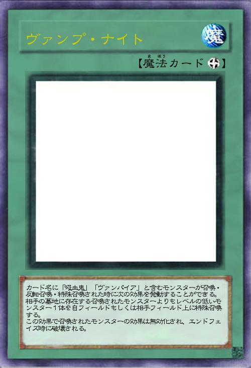 カード名に「吸血鬼」「ヴァンパイア」と含むモンスターが召喚・反転召喚・特殊召喚された時に次の効果を発動することができる。 相手の墓地に存在する召喚されたモンスターよりもレベルの低いモンスター1体を自フィールドもしくは相手フィールド上に特殊召喚する。 この効果で召喚されたモンスターの効果は無効化され、エンドフェイズ時に破壊される。 |
