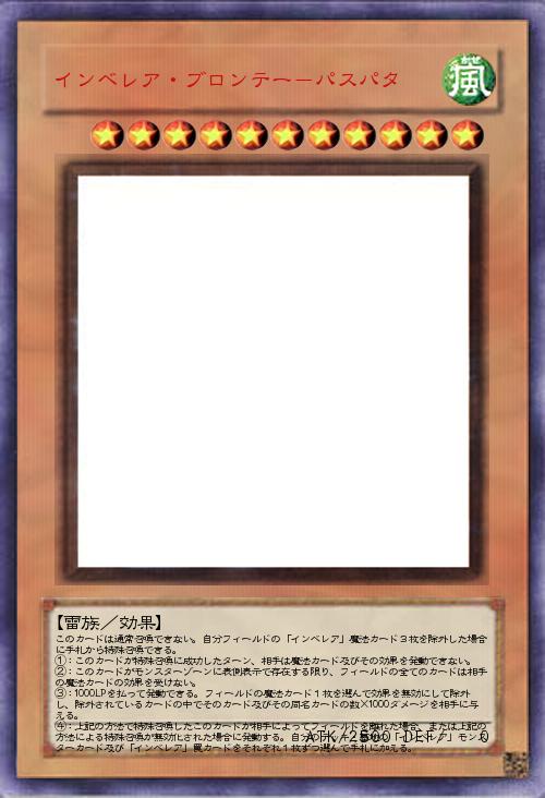 | このカードは通常召喚できない。自分フィールドの「インベレア」魔法カード3枚を除外した場合に手札から特殊召喚できる。 ①:このカードが特殊召喚に成功したターン、相手は魔法カード及びその効果を発動できない。 ②:このカードがモンスターゾーンに表側表示で存在する限り、フィールドの全てのカードは相手の魔法カードの効果を受けない。 ③:1000LPを払って発動できる。フィールドの魔法カード1枚を選んで効果を無効にして除外し、除外されているカードの中でそのカード及びその同名カードの数×1000ダメージを相手に与える。 ④:上記の方法で特殊召喚したこのカードが相手によってフィールドを離れた場合、または上記の方法による特殊召喚が無効化された場合に発動する。自分のデッキ・墓地の「インベレア」モンスターカード及び「インベレア」罠カードをそれぞれ1枚ずつ選んで手札に加える。 | |||