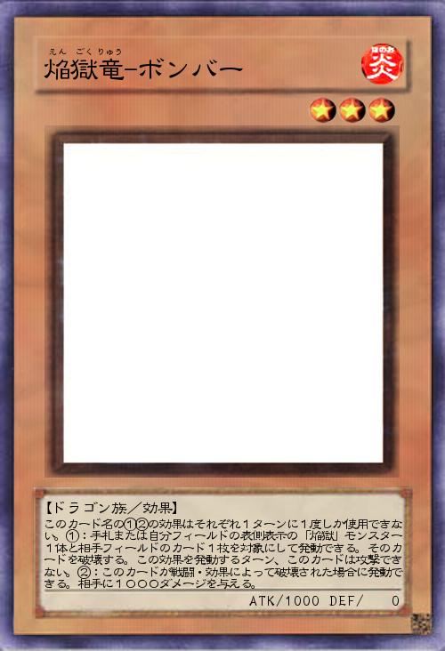 | このカード名の①②の効果はそれぞれ1ターンに1度しか使用できない。①:手札または自分フィールドの表側表示の「焔獄」モンスター1体と相手フィールドのカード1枚を対象にして発動できる。そのカードを破壊する。この効果を発動するターン、このカードは攻撃できない。②:このカードが戦闘・効果によって破壊された場合に発動できる。相手に1000ダメージを与える。 | |||