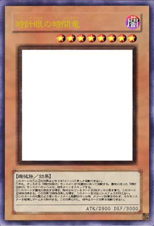 | このカードの①と②の効果はどちらも1ターンに1度しか発動できない。 ①手札、デッキから「時計仕掛け」モンスターを1枚墓地に送って発動する。墓地に送った「時計仕掛け」モンスターのレベル分、相手ターンをスキップする。 ②このカードが墓地に存在する場合、除外されているカードを2枚デッキに戻す事で、このカードを特殊召喚する。この効果で特殊召喚した場合、このターン自分はバトルフェズが行えない。 ③このカードの攻撃力より高いモンスターと戦闘を行った時、ダメージ計算を行わず、そのモンスターを破壊しゲームから除外する。この効果に対し、相手はカード効果を発動できない。 | |||