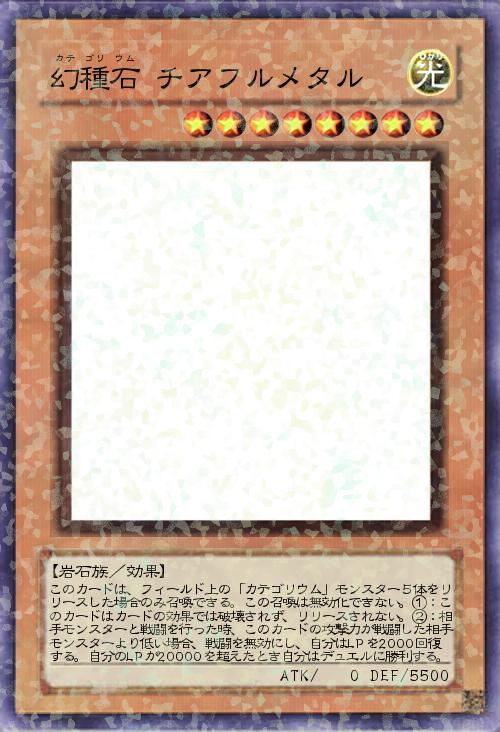| このカードは、フィールド上の「カテゴリウム」モンスター5体をリリースした場合のみ召喚できる。この召喚は無効化できない。①:このカードはカードの効果では破壊されず、リリースされない。②:相手モンスターと戦闘を行った時、このカードの攻撃力が戦闘した相手モンスターより低い場合、戦闘を無効にし、自分はLPを2000回復する。自分のLPが20000を超えたとき自分はデュエルに勝利する。 | |||