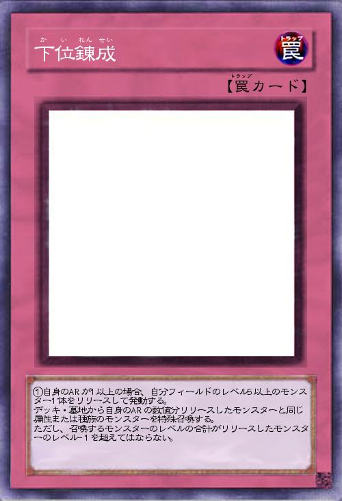 | ①自身のARが1以上の場合、自分フィールドのレベル5以上のモンスター1体をリリースして発動する。 デッキ・墓地から自身のARの数値分リリースしたモンスターと同じ属性または種族のモンスターを特殊召喚する。 ただし、召喚するモンスターのレベルの合計がリリースしたモンスターのレベル-1を超えてはならない。 | |||