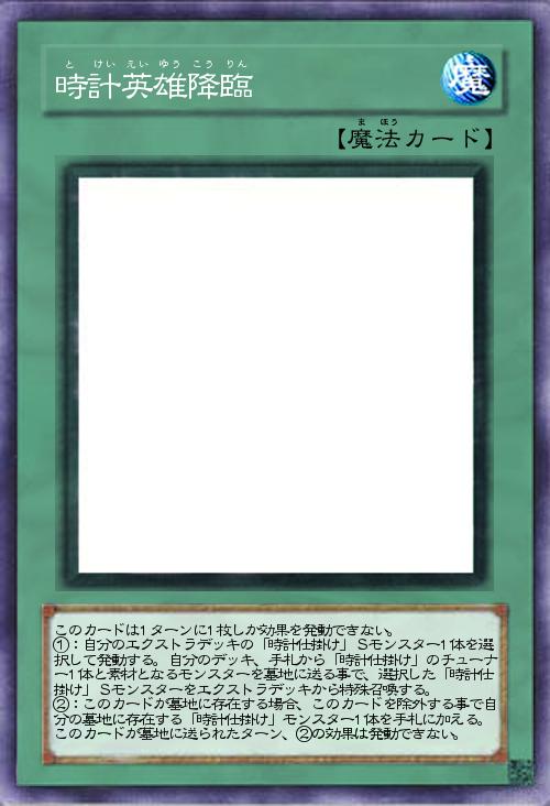 | このカードは1ターンに1枚しか効果を発動できない。 ①:自分のエクストラデッキの「時計仕掛け」Sモンスター1体を選択して発動する。自分のデッキ、手札から「時計仕掛け」のチューナー1体と素材となるモンスターを墓地に送る事で、選択した「時計仕掛け」Sモンスターをエクストラデッキから特殊召喚する。 ②:このカードが墓地に存在する場合、このカードを除外する事で自分の墓地に存在する「時計仕掛け」モンスター1体を手札に加える。このカードが墓地に送られたターン、②の効果は発動できない。 | |||