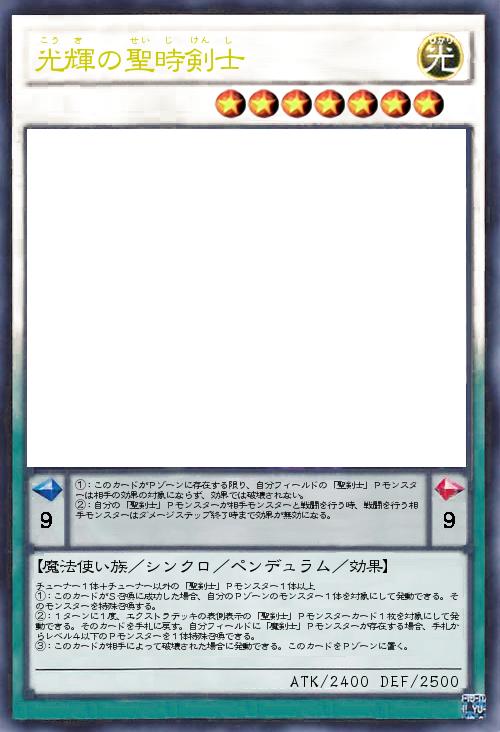「係さんありがとうございます。「時剣士」Sモンスターは「聖剣士」そのものとして成長したので属性は扱えますが基本的に「光」のペンデュラム枠として光属性固定の予定です。