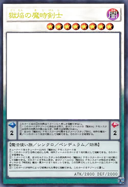 P効果は光輝と同様の耐性の魔剣版。さらに、こちらにも除去が搭載されており、魔剣士が攻撃するダメステ前に相手の魔法・罠ゾーンのカードの除去ができるため、厄介そうなバックは燃やしてしまいましょう。これから毎日(ry」(2017-10-09 04:41)