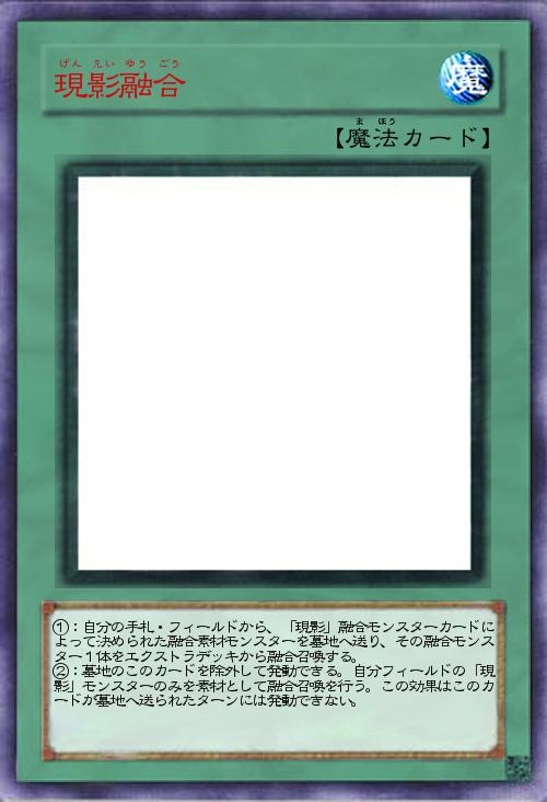 | ①:自分の手札・フィールドから、「現影」融合モンスターカードによって決められた融合素材モンスターを墓地へ送り、その融合モンスター1体をエクストラデッキから融合召喚する。 ②:墓地のこのカードを除外して発動できる。自分フィールドの「現影」モンスターのみを素材として融合召喚を行う。この効果はこのカードが墓地へ送られたターンには発動できない。 | |||