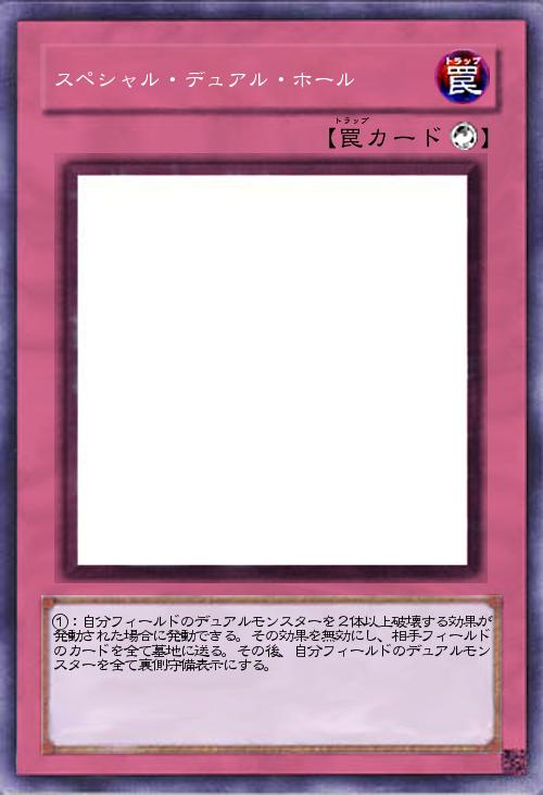 | ①:自分フィールドのデュアルモンスターを2体以上破壊する効果が発動された場合に発動できる。その効果を無効にし、相手フィールドのカードを全て墓地に送る。その後、自分フィールドのデュアルモンスターを全て裏側守備表示にする。 | |||