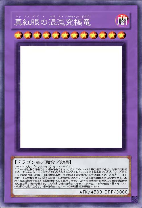 | レベル7以上の「レッドアイズ」モンスター×4 このカードは融合召喚でしか特殊召喚できない。①:このカードが融合召喚に成功した時に発動できる。デッキから「レッドアイズ」のテキストが記されたカードを1枚手札に加える。②:このカードを融合召喚した際、「真紅眼の黒竜」を2体以上融合素材として使用した時、このカードはその数+1回攻撃できる。③:このカードが相手の効果でフィールドから離れた時に発動できる。墓地・または除外されている融合素材として使用したモンスターを召喚条件を無視して表側攻撃表示で可能な限り特殊召喚する。この効果で特殊召喚されたモンスターは、相手の魔法・罠・モンスター効果の対象にならず、特殊召喚されたターンのみ戦闘では破壊されない。 | |||