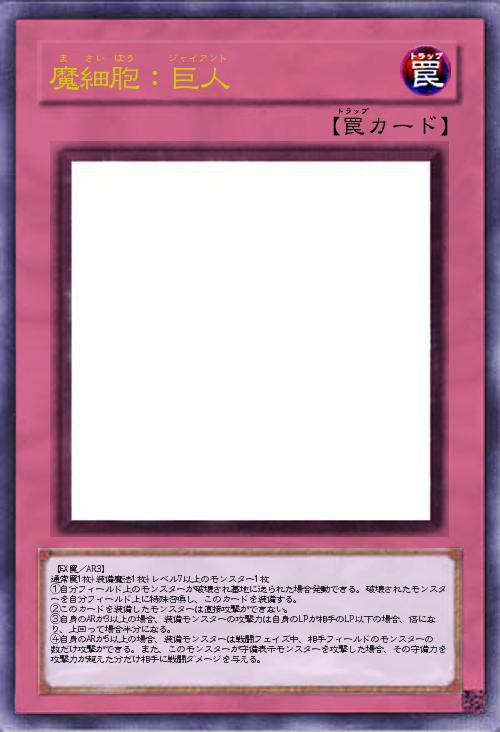 | 【EX罠/AR3】 通常罠1枚+装備魔法1枚+レベル7以上のモンスター1枚 ①自分フィールド上のモンスターが破壊され墓地に送られた場合発動できる。破壊されたモンスターを自分フィールド上に特殊召喚し、このカードを装備する。 ②このカードを装備したモンスターは直接攻撃ができない。 ③自身のARが3以上の場合、装備モンスターの攻撃力は自身のLPが相手のLP以下の場合、倍になり、上回って場合半分になる。 ④自身のARが5以上の場合、装備モンスターは戦闘フェイズ中、相手フィールドのモンスターの数だけ攻撃ができる。また、このモンスターが守備表示モンスターを攻撃した場合、その守備力を攻撃力が超えた分だけ相手に戦闘ダメージを与える。 | |||
