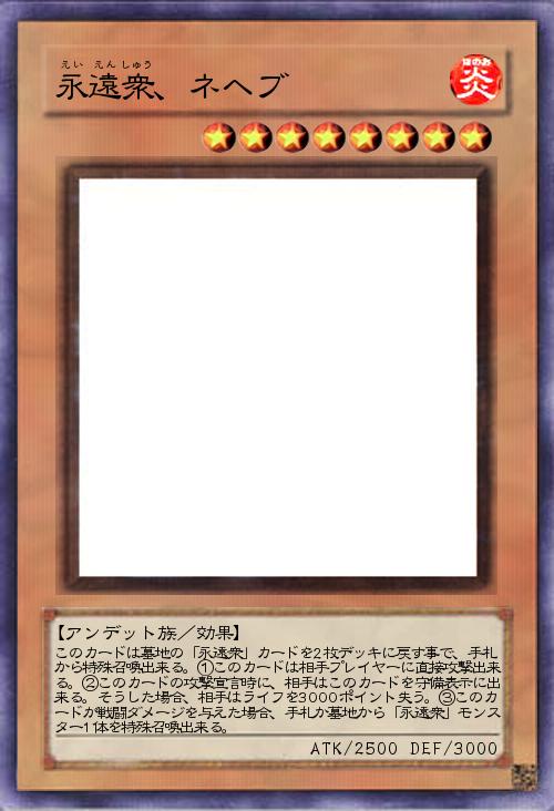 | このカードは墓地の「永遠衆」カードを2枚デッキに戻す事で、手札から特殊召喚出来る。①このカードは相手プレイヤーに直接攻撃出来る。②このカードの攻撃宣言時に、相手はこのカードを守備表示に出来る。そうした場合、相手はライフを3000ポイント失う。③このカードが戦闘ダメージを与えた場合、手札か墓地から「永遠衆」モンスター1体を特殊召喚出来る。 | |||