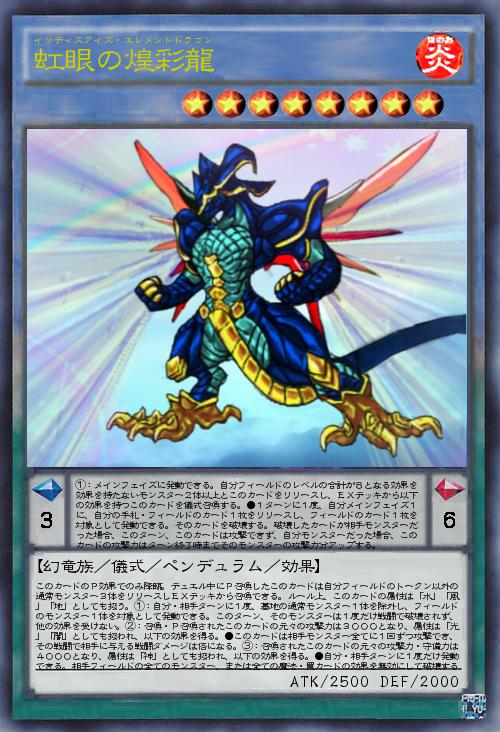 「ついに登場したる儀式Pモンスターは虹色に輝けし幻竜……虹眼の煌彩龍!カラフルでありながら、神々しさも感じられるこの竜にはなんと3つもの召喚法が存在するとのこと!?最初口上が3つもあってなんぞと思ったらこういうことでしたか…!口上だけでなく、8種類にも及ぶ効果・攻撃口上も用意されている幻竜…。姿、強さも幻レベルですが、この口上の数も幻レベルに違いない…!
