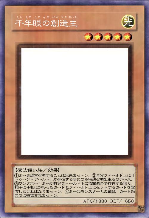 | ①ミーを通常召喚することは出来まセ~ン。②自分フィールド上に「トゥーン・ワールド」が存在する時にのみ特殊召喚出来るのデ~ス。③ワンダホ~!ミーが自分フィールド上に攻撃表示で存在する限り、相手は手札に加わったカードとフィールド上にセットするカードを宣言しなければなりまセ~ン。④ミーはモンスターとの戦闘、カード効果では破壊されまセ~ン。 | |||