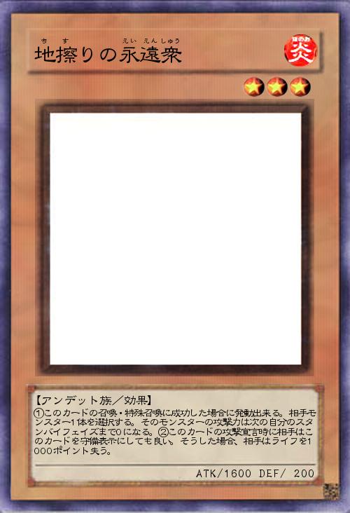 | ①このカードの召喚・特殊召喚に成功した場合に発動出来る。相手モンスター1体を選択する。そのモンスターの攻撃力は次の自分のスタンバイフェイズまで0になる。②このカードの攻撃宣言時に相手はこのカードを守備表示にしても良い。そうした場合、相手はライフを1000ポイント失う。 | |||