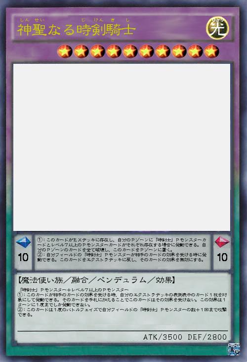 | 「時剣士」Pモンスター+レベル7以上のPモンスター ①:このカードが相手のカードの効果を受ける時、自分のエクストラデッキの表側表示のカード1枚を対象にして発動できる。そのカードを手札に加えることでこのカードはその効果を受けない。この効果は1ターンに1度までしか発動できない。 ②:このカードは1度のバトルフェイズで自分フィールドの「時剣士」Pモンスターの数+1回まで攻撃できる。 | |||