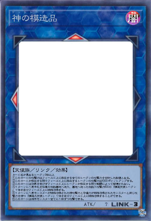| カード名が異なるトークン3体以上 ①このカードの攻撃力はフィールド上に存在する全てのトークンの攻撃力を合計した数値となる。 ②このカードが存在する限りフィールド上に存在するトークンの攻撃力は1000ポイントアップする。 ③このカードは効果を受けずフィールド上にトークンが存在する限り戦闘によって破壊されない。 ④1ターンに1度手札を任意の枚数墓地へ送り、墓地へ送った枚数×攻撃力600の「模造天使トークン」1体を自分フィールド上に特殊召喚する。 ⑤1ターンに1度モンスターが特殊召喚された時攻撃力と守備力が特殊召喚されたモンスターと同じ攻撃力を持つ「模造大天使トークン」1体を自分フィールド上に特殊召喚することができる。 ⑥このカードは相手モンスター全てに1回ずつ攻撃できる。 | |||