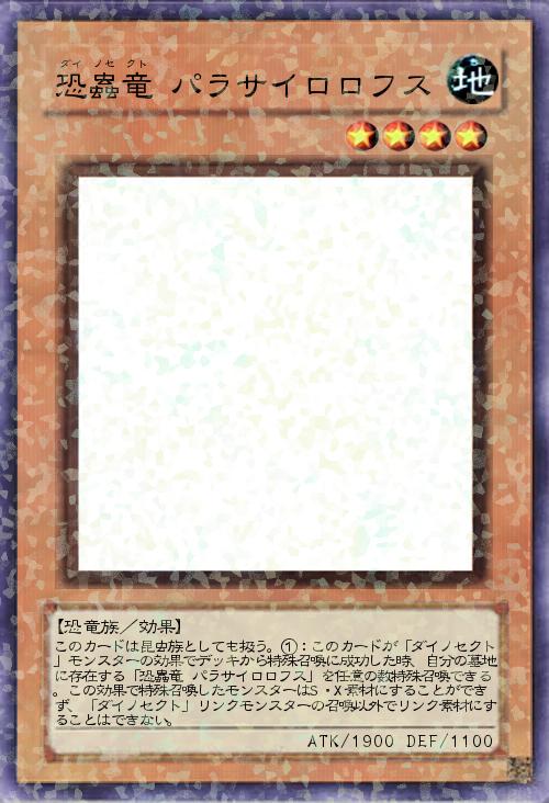 | このカードは昆虫族としても扱う。①:このカードが「ダイノセクト」モンスターの効果で特殊召喚に成功した時、自分の墓地に存在する「恐蟲竜 パラサイロロフス」を任意の数特殊召喚できる。この効果で特殊召喚したモンスターはS・X素材にすることができず、「ダイノセクト」リンクモンスターの召喚以外でリンク素材にすることはできない。 | |||