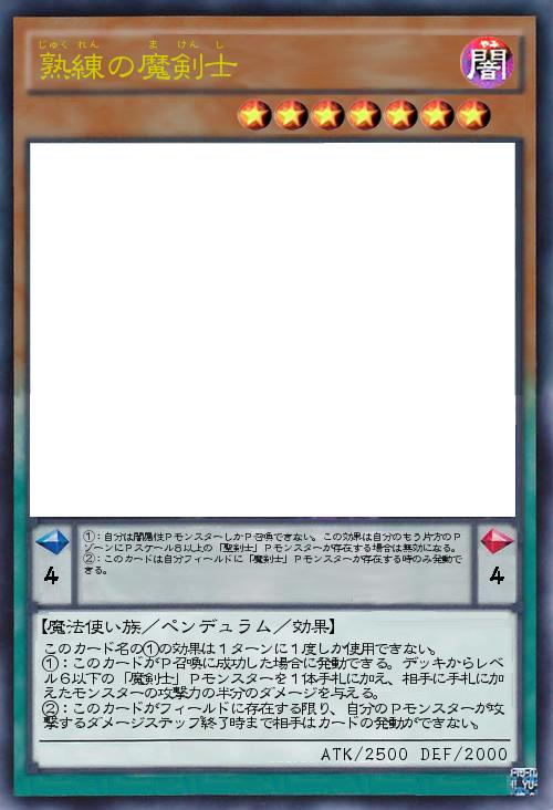 | このカード名の①の効果は1ターンに1度しか使用できない。 ①:このカードがP召喚に成功した場合に発動できる。デッキからレベル6以下の「魔剣士」Pモンスターを1体手札に加え、相手に手札に加えたモンスターの攻撃力の半分のダメージを与える。 ②:このカードがフィールドに存在する限り、自分のPモンスターが攻撃するダメージステップ終了時まで相手はカードの発動ができない。 | |||