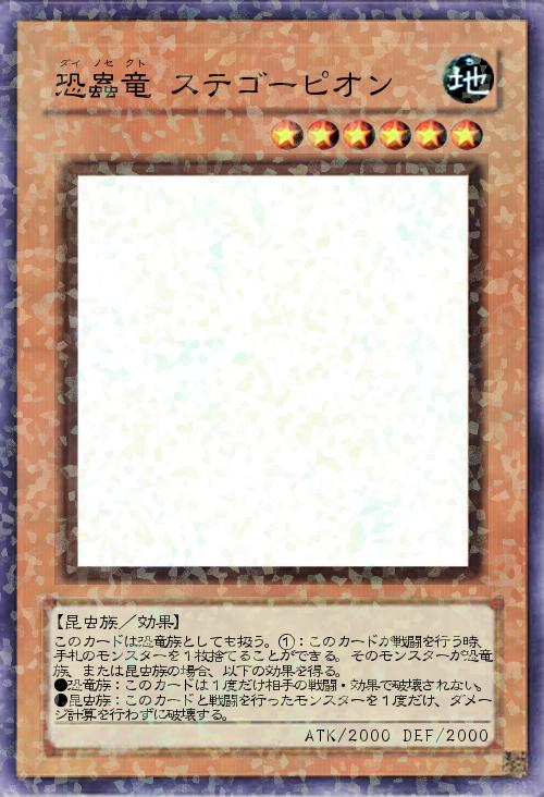 | このカードは恐竜族としても扱う。①:このカードが戦闘を行う時、手札のモンスターを1枚捨てることができる。そのモンスターが恐竜族、または昆虫族の場合、以下の効果を得る。 ●恐竜族:このカードは1度だけ相手の戦闘・効果で破壊されない。 ●昆虫族:このカードと戦闘を行ったモンスターを1度だけ、ダメージ計算を行わずに破壊する。 | |||