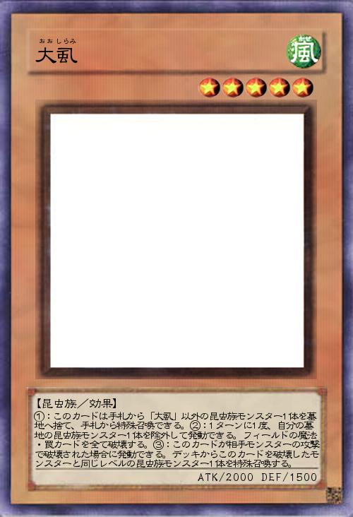 | ①:このカードは手札から「大虱」以外の昆虫族モンスター1体を墓地へ捨て、手札から特殊召喚できる。②:1ターンに1度、自分の墓地の昆虫族モンスター1体を除外して発動できる。フィールドの魔法・罠カードを全て破壊する。③:このカードが相手モンスターの攻撃で破壊された場合に発動できる。デッキからこのカードを破壊したモンスターと同じレベルの昆虫族モンスター1体を特殊召喚する。 | |||