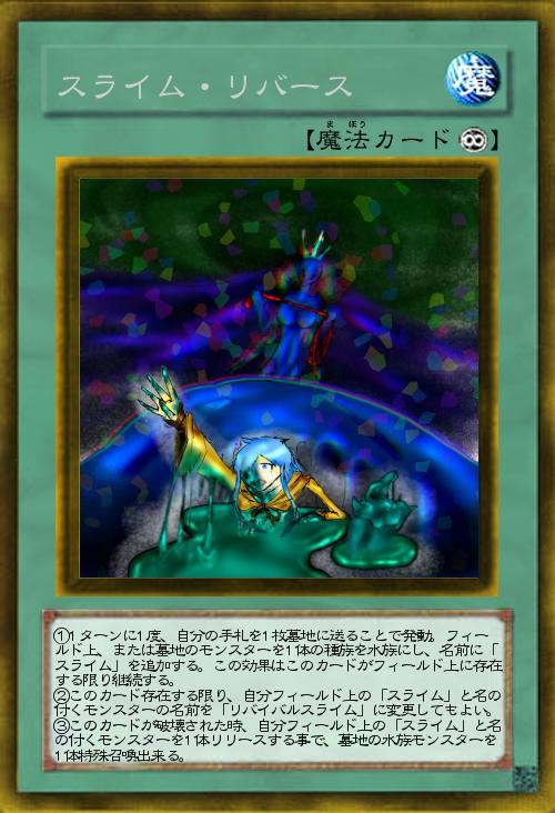 モンスターをスライムに、さらにスライムをルバイバルスライムに生まれ変わらせ、最後にはスライムを別のモンスターに生まれ変わらせる。と言った感じです。基本蘇生カードとして使われそうですが、墓地送りや種族変化を利用して色々出来そうなカードにしました。」(2017-10-17 07:37)